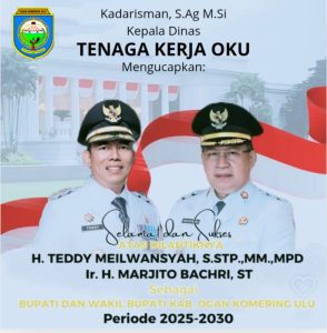 Kepala Dinas Tenaga Kerja OKU, Kadarisman, S.Ag MM mengucapkan selamat atas dilantiknya Bupati dan Wakil Bupati OKU, Teddy Meilwansyah dan Marjito Bachri Periode 2025-2030.